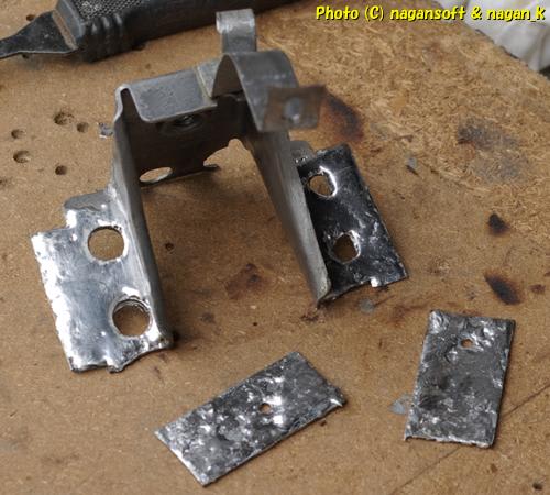 300Wのハンダコテを押し付けます。1.5mmの鉄板越しに炙る+バイスプライヤーが放熱フィンになって、なかなかに時間がかかります。