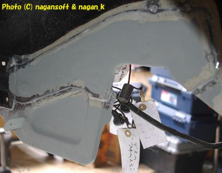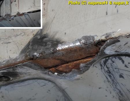 私のは、いままで紹介のとおり、腐れ鉄板切り捨て、ハンダ盛りして、さらに隙間がサビサビなのでリューターでほじって、どうしても取りきれない奥を狙って錆び転換処置です。