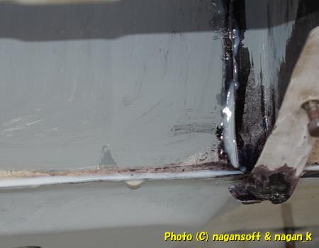 右リヤフェンダーはまだ程度がよかったので処置していなかったのですが、スクレッパーを挿してみたらパネルの合わせ目にサクサクと入っていくので、ボンドすることにしました。