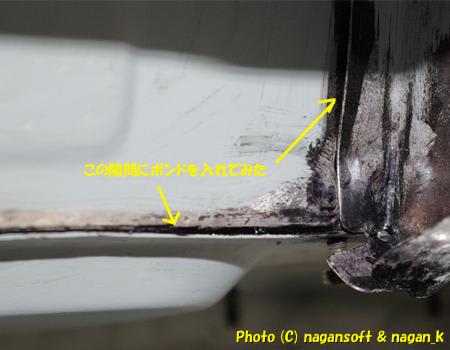正攻法は、自動車鈑金用のパネルボンド(2液のタイプ)を流し込むのだと思うけど、調べたところ、ボンドが高いのはもちろんだけど、専用のガンまで必要ということがわかり、そんなのは貧乏人はダメ―となったのです。