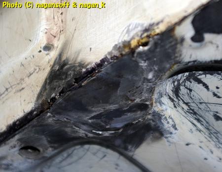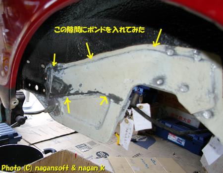 R-2君、エンジンルームのパネル隙間にボンドを入れてみた。そして、いよいよ左リヤフェンダーの大錆び穴