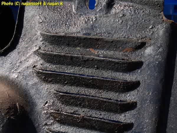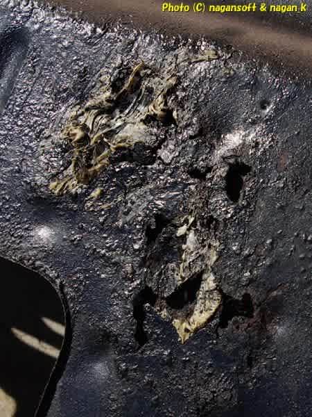 エンジンカバー中央に鉄板が2重になっているところがあります。強度出し、または、共振止めといった意味があるものと思いますが、鉄板が重なっていることで錆を呼び込んでこんな状況なんですよ。