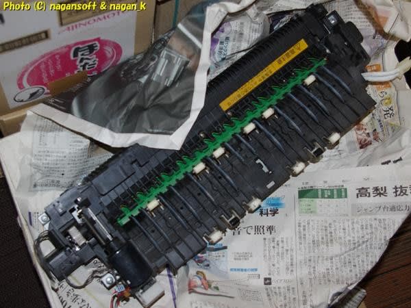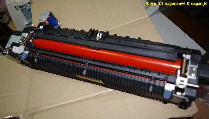 このタイプのEPSONカラーレーザーはこの個体で4台目なんです。古いプリンターを廃棄するときに交換部品としてある程度の部品を剥ぎ取ってキープしています。もちろん定着器も部品取りキープしているんですよ。