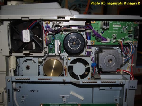 サイドカバーを取り外してドラムやトナーといった回転部品制御部分を目視確認です。特に問題無しと判断します。