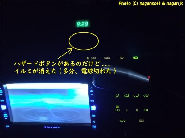 ハザードボタン(非常点滅点灯ボタン)の夜間イルミが電球切れです。