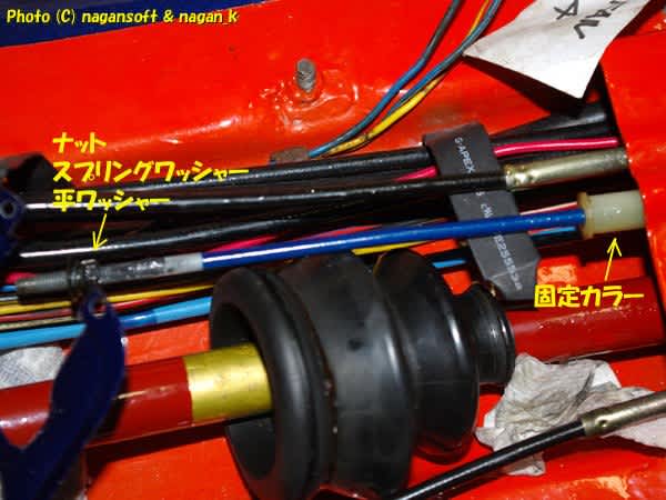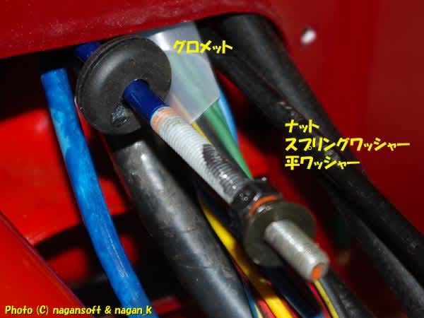 ワイヤー側から、グロメット(これは私が追加している)、ナット、スプリングワッシャー、平ワッシャーです。