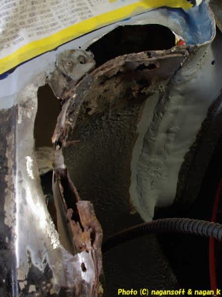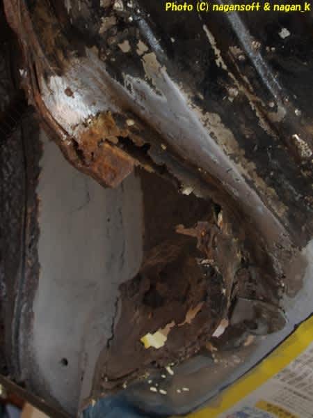 右前フェンダーエプロンと運転席床手前側の合わせ目が錆びて縁切りしています。