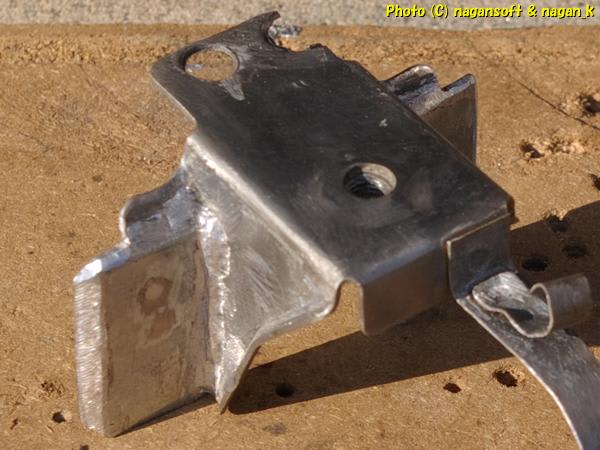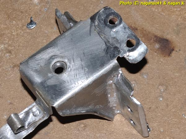 いよいよ、シートブラケット上の引きちぎったようになっているスポット溶接痕をボルト通し穴へ加工します。