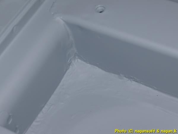 だって、ハンダ板金して錆止め塗って、さび止め塗料を砥いで、その上にプラサフです。その程度だとこんな感じの仕上がりです。