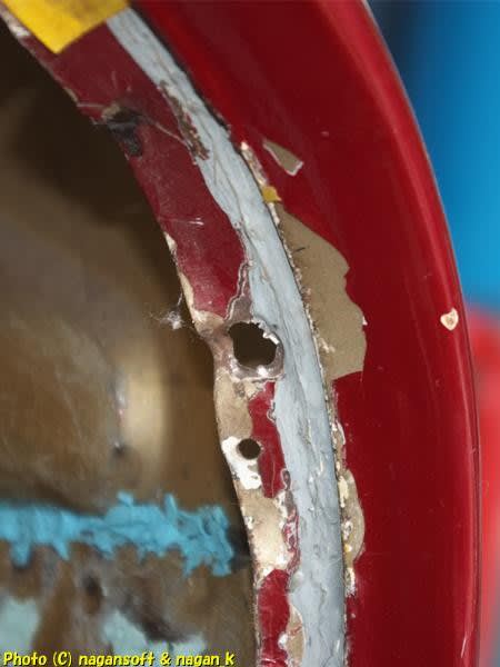 ともかく凹んでいるし、角端の強度がありそうなところを突いているってことなので、結構な力で押されているんだうろと推論です。