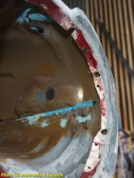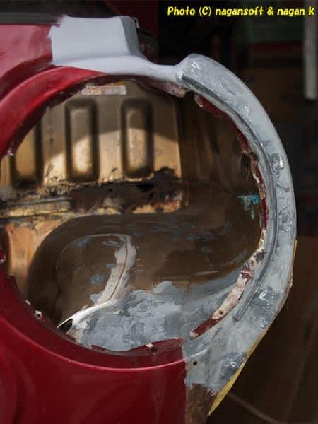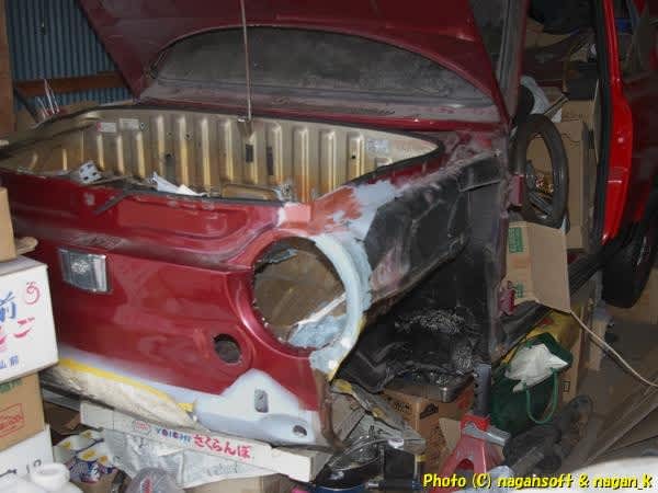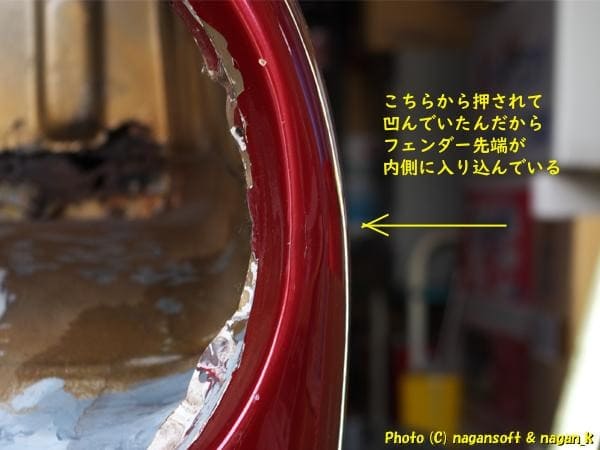 凹みとなった原因は外側から突かれているはずです。ついてはフェンダー先端が内側に入っているのよ。