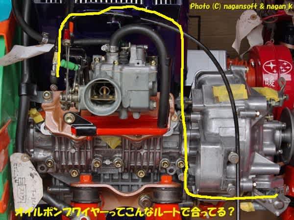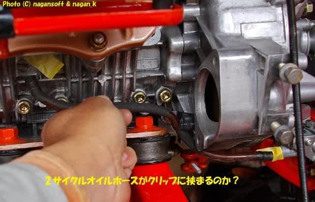 オイルポンプワイヤーの取り回し、と、2サイクルオイルホースの取り回しです。