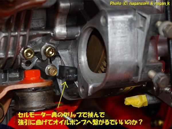 セルモーター奥にクリップがあり、そこにワイヤーを固定して、クイッって曲げれば確かにオイルポンプへ向うのです。