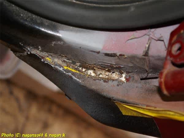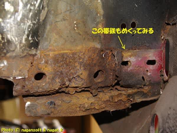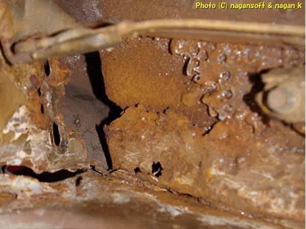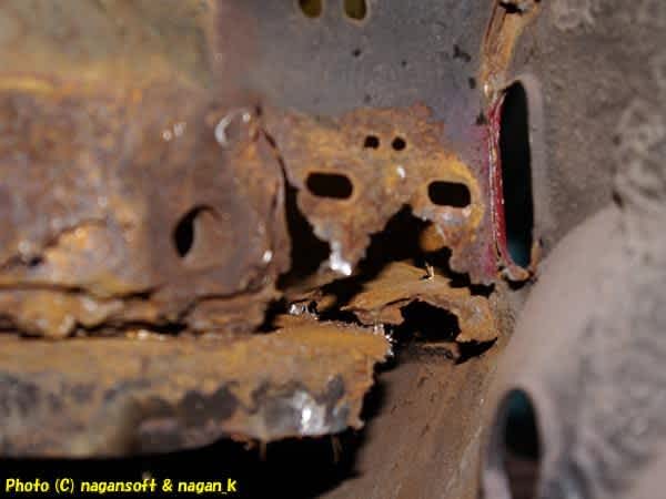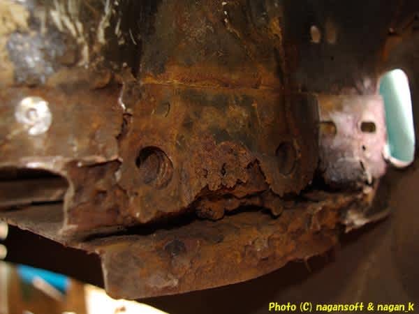 フェンダー側には強度出しで薄い帯鉄が貼られているのですが、帯鉄自体は錆びて強度無しです。