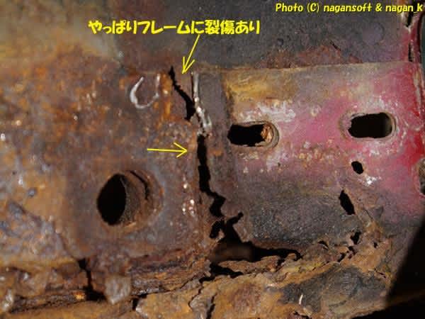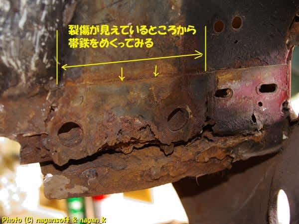 めくって現れたのは、奥の裂傷はフレーム側も続いてます。というか帯鉄よりフレームの方が酷いです。