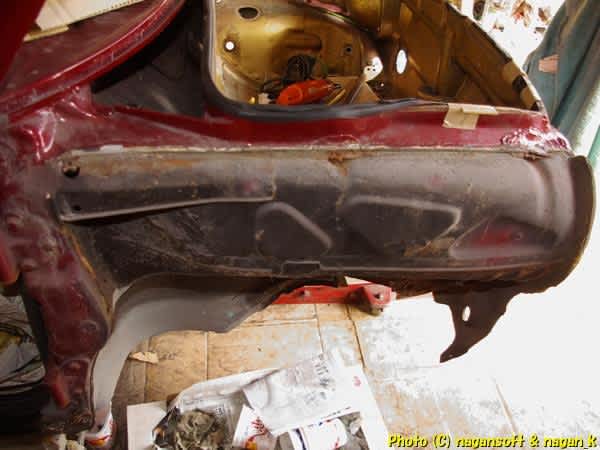 トランク床のパッチ鉄板が下鉄板に密着していません。というかそもそもいいかげんに曲げて溶接されてます。さすが痴呆親父。