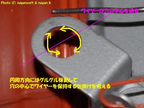 ひっぱり力をスムーズに伝えるためには、8mm穴の中心位置にてワイヤーを保持する必要があるのでは?