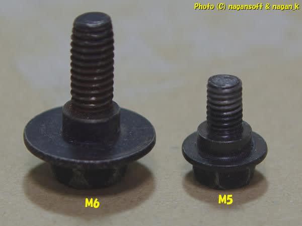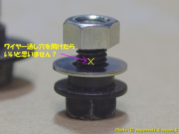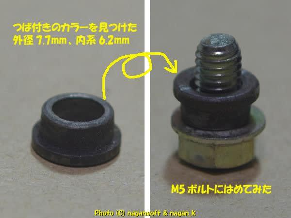 M5のやつに、平ワッシャーとナットを嵌めて、ボルト軸に穴を開けたときのイメージをしてみる。
