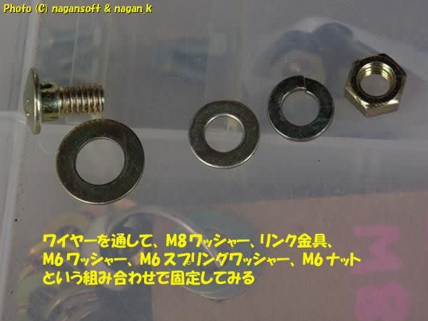 これを、ワイヤーを通して、M8ワッシャー(ワイヤーを押さえ込むため)、リンク金具、M6ワッシャー、M6スプリングワッシャー、M6ナット、の順番に組み入れてみました。