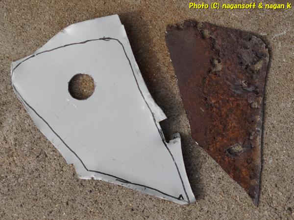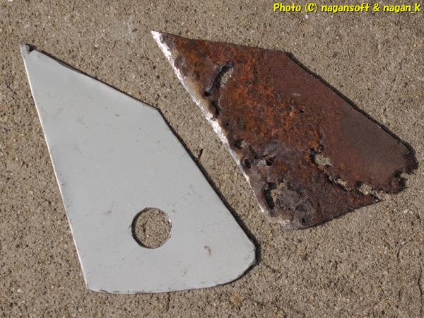 写真の左側が作成途中のパッチ鉄板です。右側が梁裏から切開取り出しした朽ちた鉄板です。