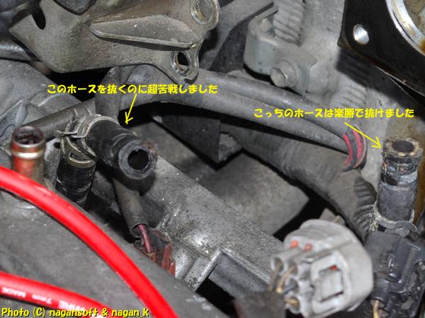 そうそう。今回の作業で一番苦戦したのは、スロットルボティーへ横から差し込まれている冷却水のホースを抜くことでした。