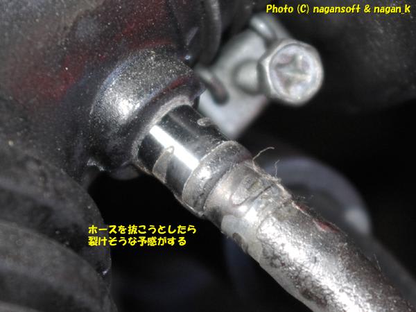 このホースを抜くのに、ホース切れるなよーのドキドキもあるので超慎重にクソ硬いホースを撫でまわしてまして、30分ぐらいかかってます。たった、この1本のホースにですよ。