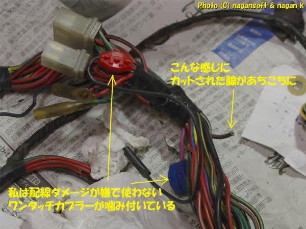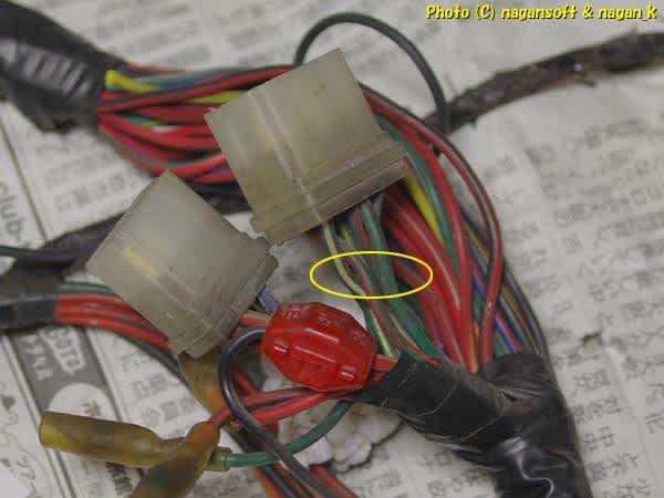 私が30年前に乗っていたときはウインカー配線を引き出して、黄色ウインカーを増設していたのよね。なのでハーネスを見たらわかるはず。
