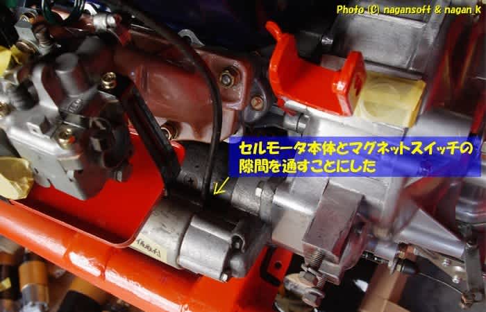 セルモーターとエンジンの隙間を通すか、セルモーターの手前を通すか、とかいろいろとやってみました。って1時間ぐらい組んではバラシをしてますよ。