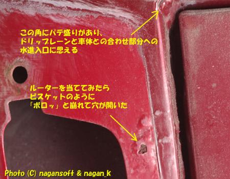 どうみても、ここはパテが入っています。スクレッパーでつついたら、パテにクラックがあって少し浮いています。