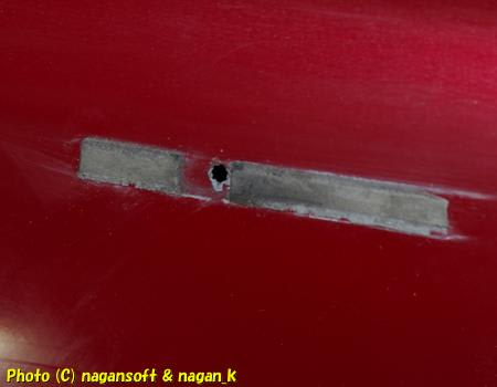 板金屋が全塗装したときに、取り外して折ったのでしょう。そして、板金屋ルールでは両面テープで補強貼り付けってことですかね。