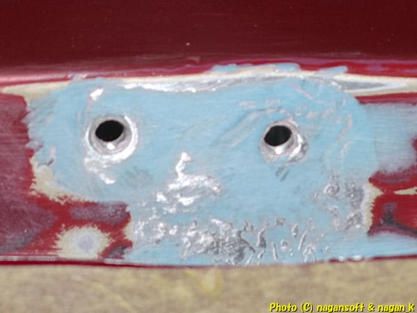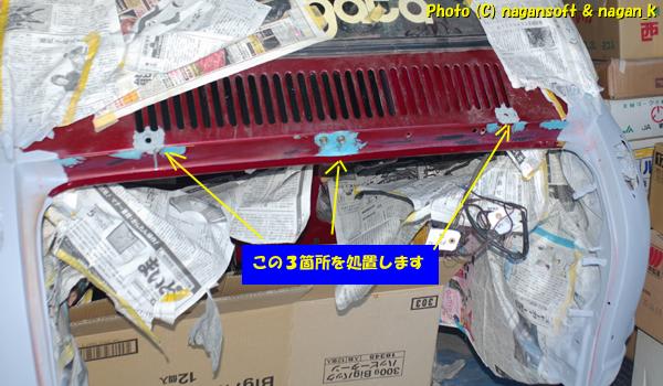 「エンジンフードを固定する部分」と、「エンジンフードつっかえ棒受け金具を取り付ける部分」を処置します。