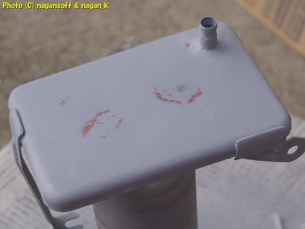 オルタネータブラケットの色を塗っていない残り部分と、ヒーター大気放出ホースの先端内側部分にPOR-15を塗りこみます。