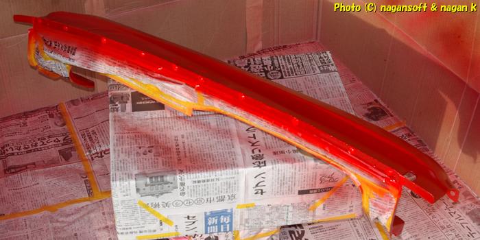 そうそう、本日の塗装インターバルの間に、埃トッピング仕上げになった蛍光ピンクなやつをサンドペーパーで研いでみました。