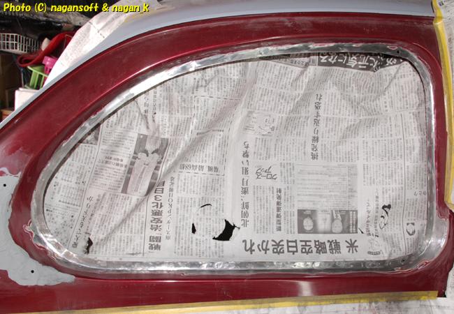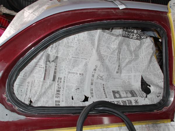 右クオーターガラスはめ合い部のサビ取りを徹底します。ともかくしつこく錆びを削り取りました。