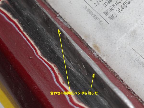 本当は、スポットを剥がして鉄板が綺麗に会うように微妙な鈑金をして、ぴったりくっつけて再度スポット溶接しなおすべきです。私の場合はスポット溶接の術がありませんので、べったりとハンダで合体ですな。