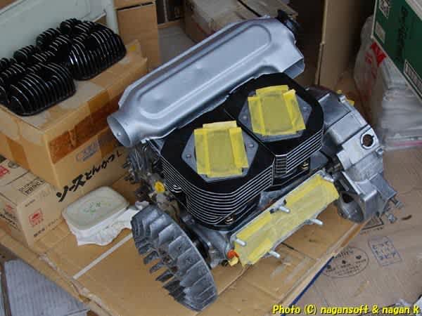 エンジン右側の冷却FANを回してシリンダーとピストンの位置あわせです。