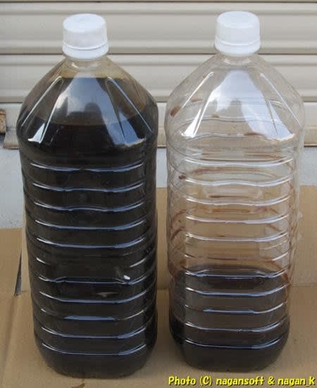 はい今回抜き取った廃油はこれです。これとは別にオイルカートリッジ抜き取りでこぼしたものが200ccぐらいあるのかな?それを加味してもオイル燃焼して白煙となってますね。