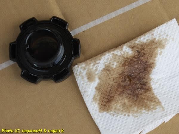 オイルフィラーキャップをキッチンペーパーで拭き取ったら、こんな感じの油汚れです。