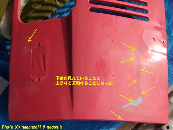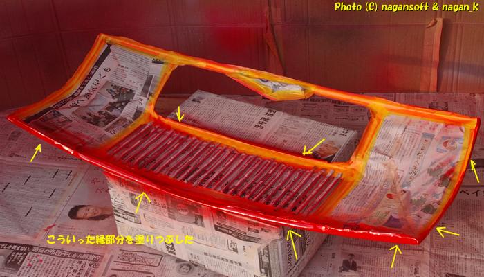 下地露出はピンクで塗りつぶすのが正攻法だと思いますが、ピンクの塗料を作って塗っていたら今日に金赤色までたどり着けません。