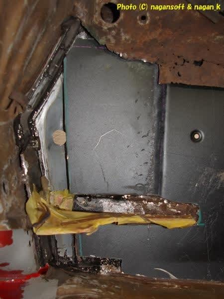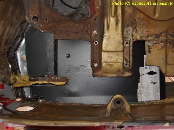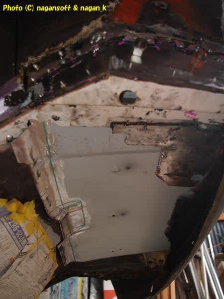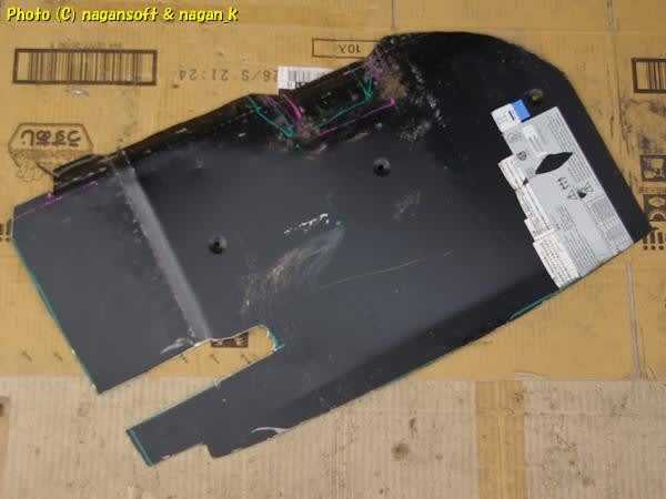 床中央鉄板を差し込んでいきます。錆ガサガサがなくなったので意外にスムーズに入っていきます。