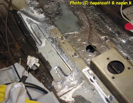 平行して進めている「助手席床とセンタートンネルとの境界線辺り」の錆び取りもしました。