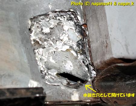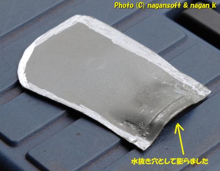 表面になるパッチ鉄板の切だしです。水抜き穴となるように端を少し曲げておきました。