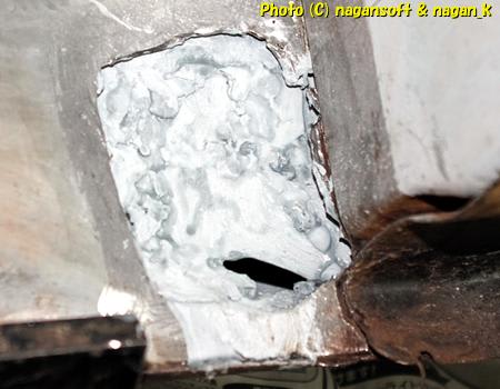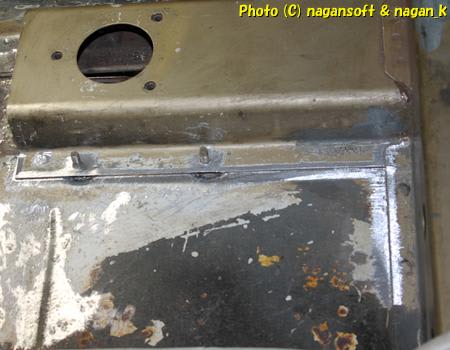 昨日の続きで、「ガソリンタンクを降ろして見える車体裏の腹部分」の左奥角隅にあるサビ穴を処置していきます。