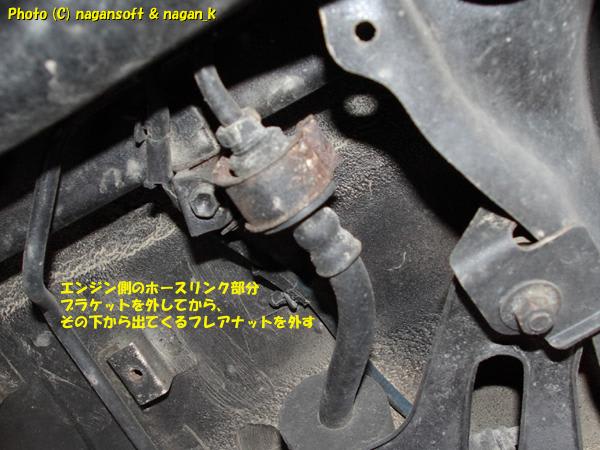 燃料ポンプからエンジン側へのホースリンク部分は、ホースリンク部分を抑えているブラケットを外してから、19mmのスパナと14mmフレアナットレンチが必要です。
