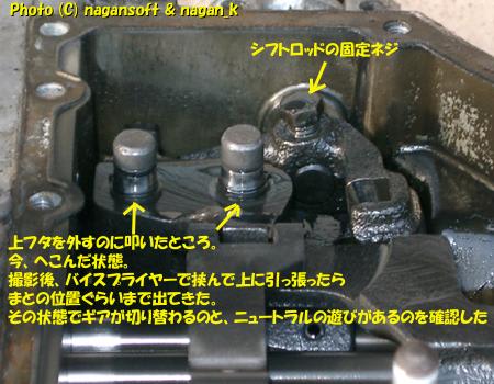 先ほど叩き込んだ部分は下がったままです。ためしにシフトロッドをカチャカチャしたところニュートラルでの遊びがありません。
