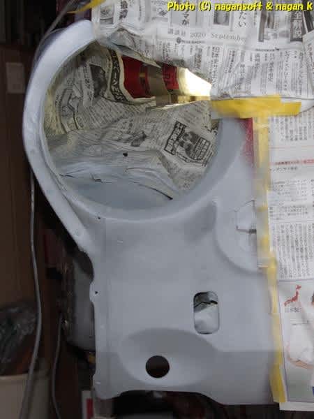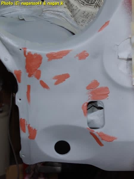 フェンダーとフロントパネルが重なる部分にパテ盛りしてます。そのパテを磨ぎました。