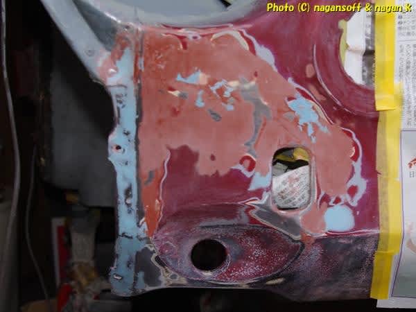 ラッカー薄付けパテが侵されてます。せっかくパテ磨ぎしたのに溶剤反応したらダメダメじゃん。