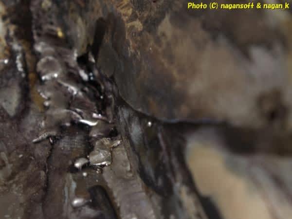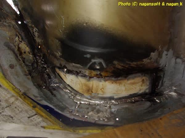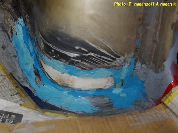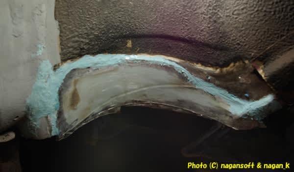 前回に鉄板あわせ隙間に錆転換剤を吹き込みました。そこが反応して黒くなってます。