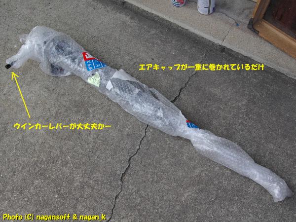 エアキャップが一重に巻いてあるだけ、ウインカーレバーが飛び出ていて梱包の体をなしていません。