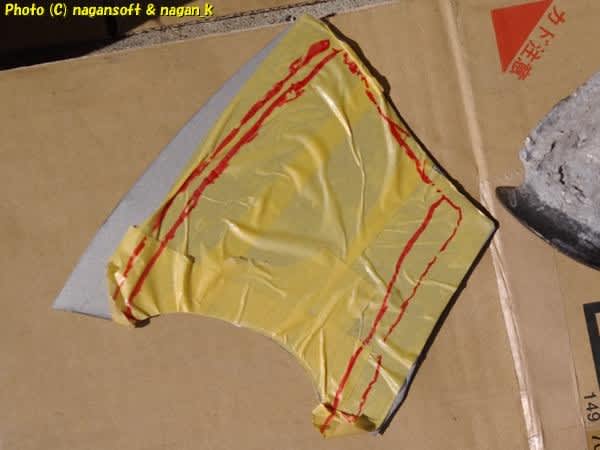 前回に型取りしたマスキングテープを廃家電鉄板に貼り付けて、ちょっと大きめにブリキハサミで切り出します。